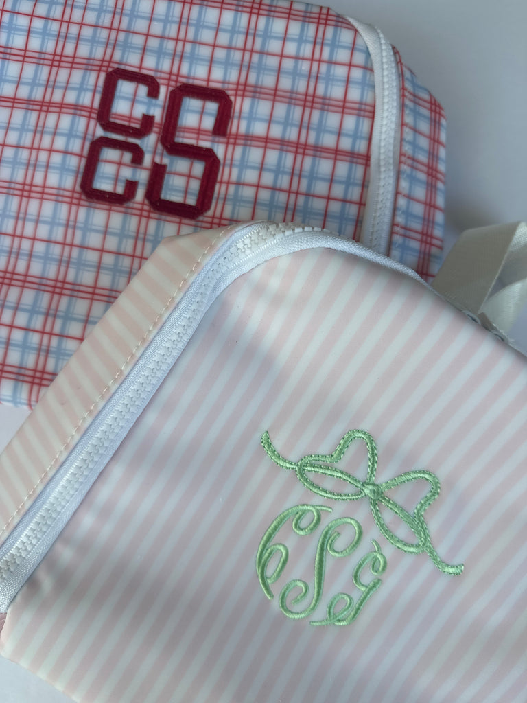 Recommendation - Name in Fishtail or Initials in Fishtail or Vienna in white or matching pink thread to create a beautiful tone-on-tone look!